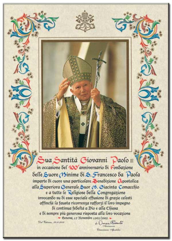 "In occasione del Centenario della nascita delle Suore Minime di San Francesco di Paola, mentre esprimo apprezzamento e viva gratitudine, auguro di cuore alla cara Congregazione Religiosa di conservare e approfondire la fedeltà alle esigenze radicali del Vangelo.